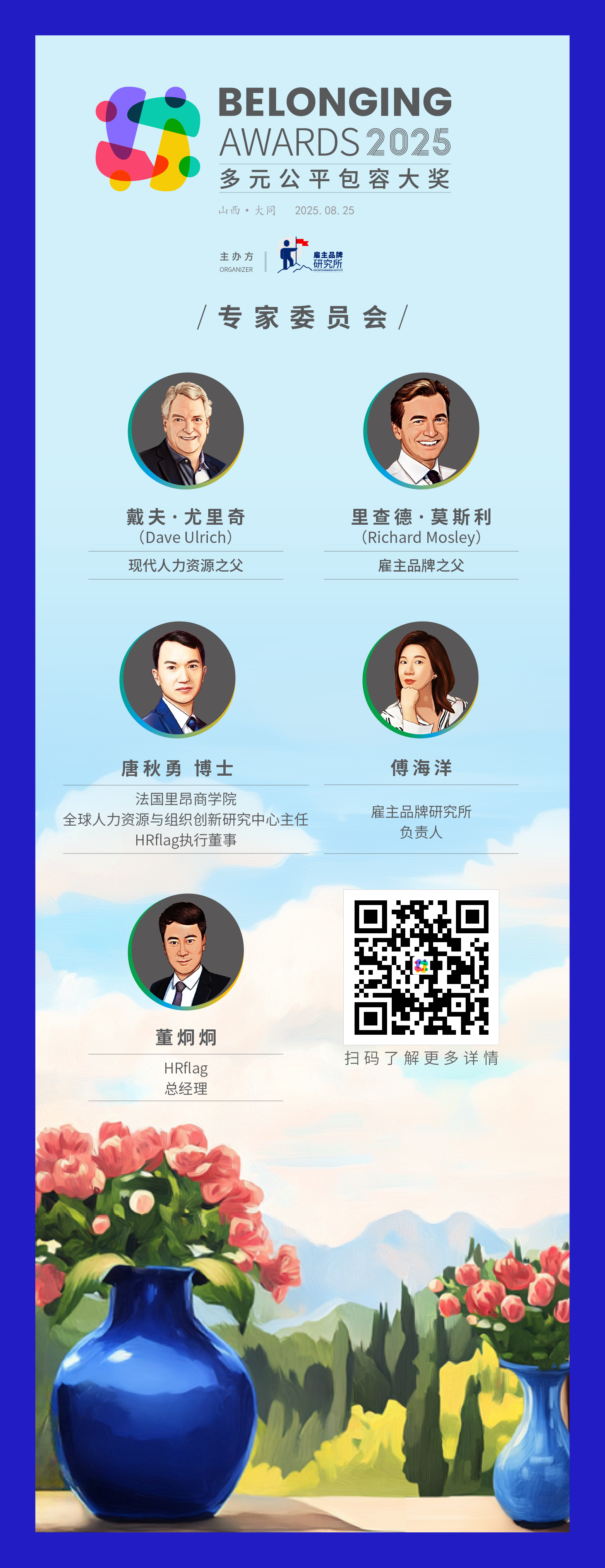 本次2025多元公平包容大奖(Belonging Awards)评委特别邀请了包括“现代人力资源之父”戴夫·尤里奇(Dave Ulrich)博士、“雇主品牌之父”里查德·莫斯利(Richard Mosley)先生、法国里昂商学院全球人力资源与组织创新研究中心主任、HRflag执行董事唐秋勇博士、雇主品牌研究所负责人傅海洋女士、HRflag总经理董炯炯先生在内的5位雇主品牌及企业人力资源管理资深专家担任本次2025多元公平包容大奖(Belonging Awards)的专家委员会。