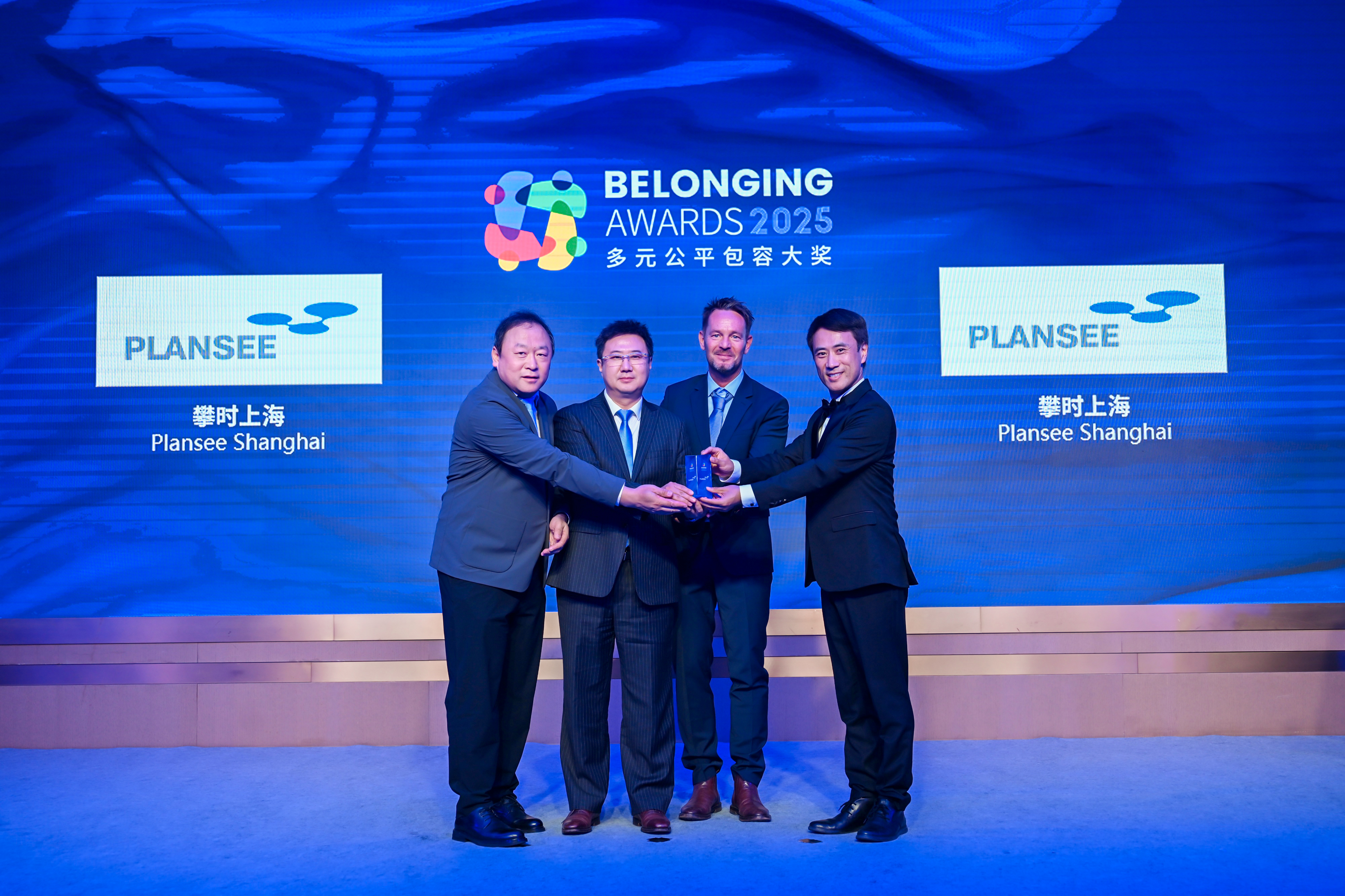 董炯炯先生(右)为攀时上海(左一、左二、左三)颁发2025“多元公平包容大奖” (Belonging Awards)