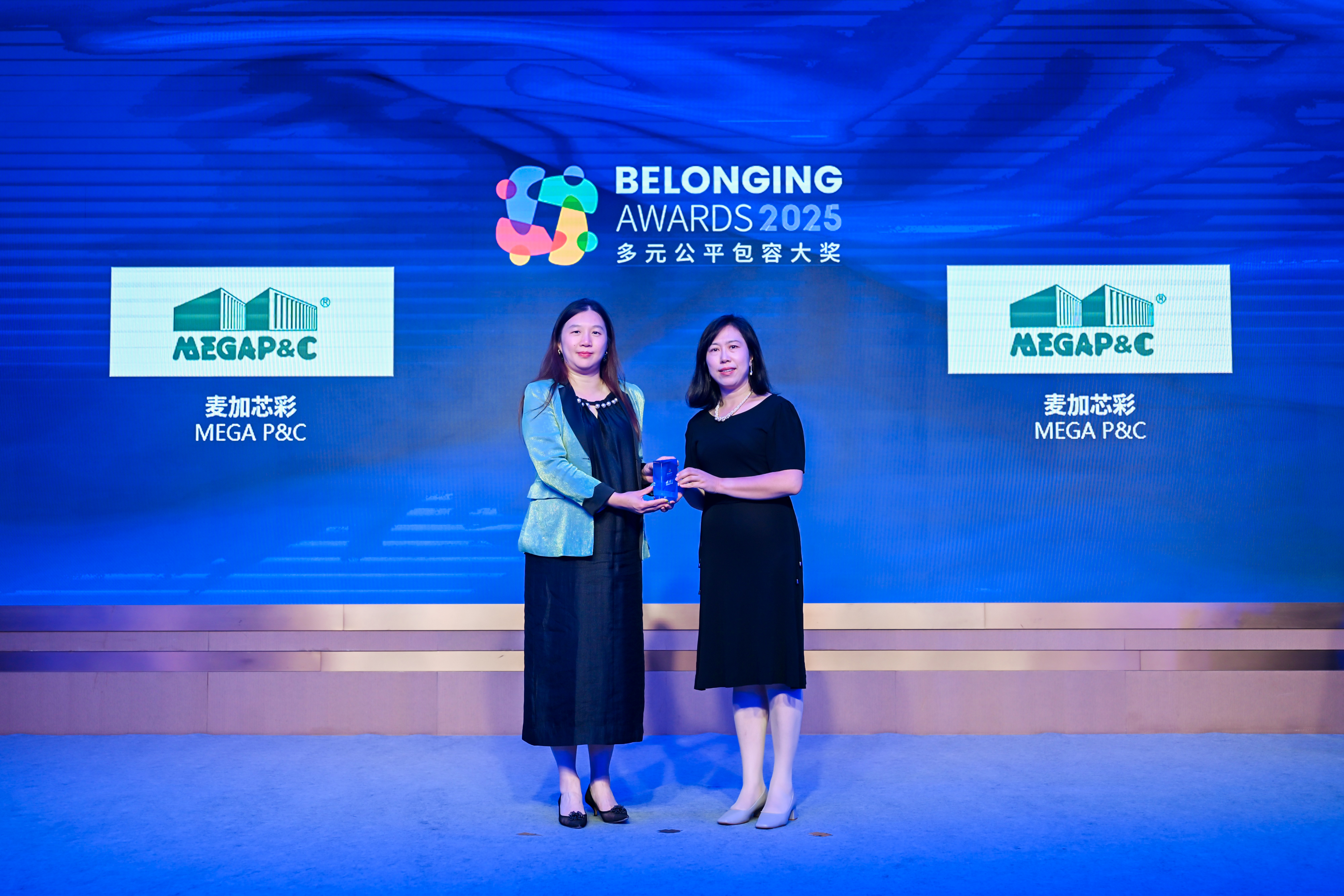 傅海洋女士(左)为麦加芯彩(右)颁发2025“多元公平包容大奖” (Belonging Awards)