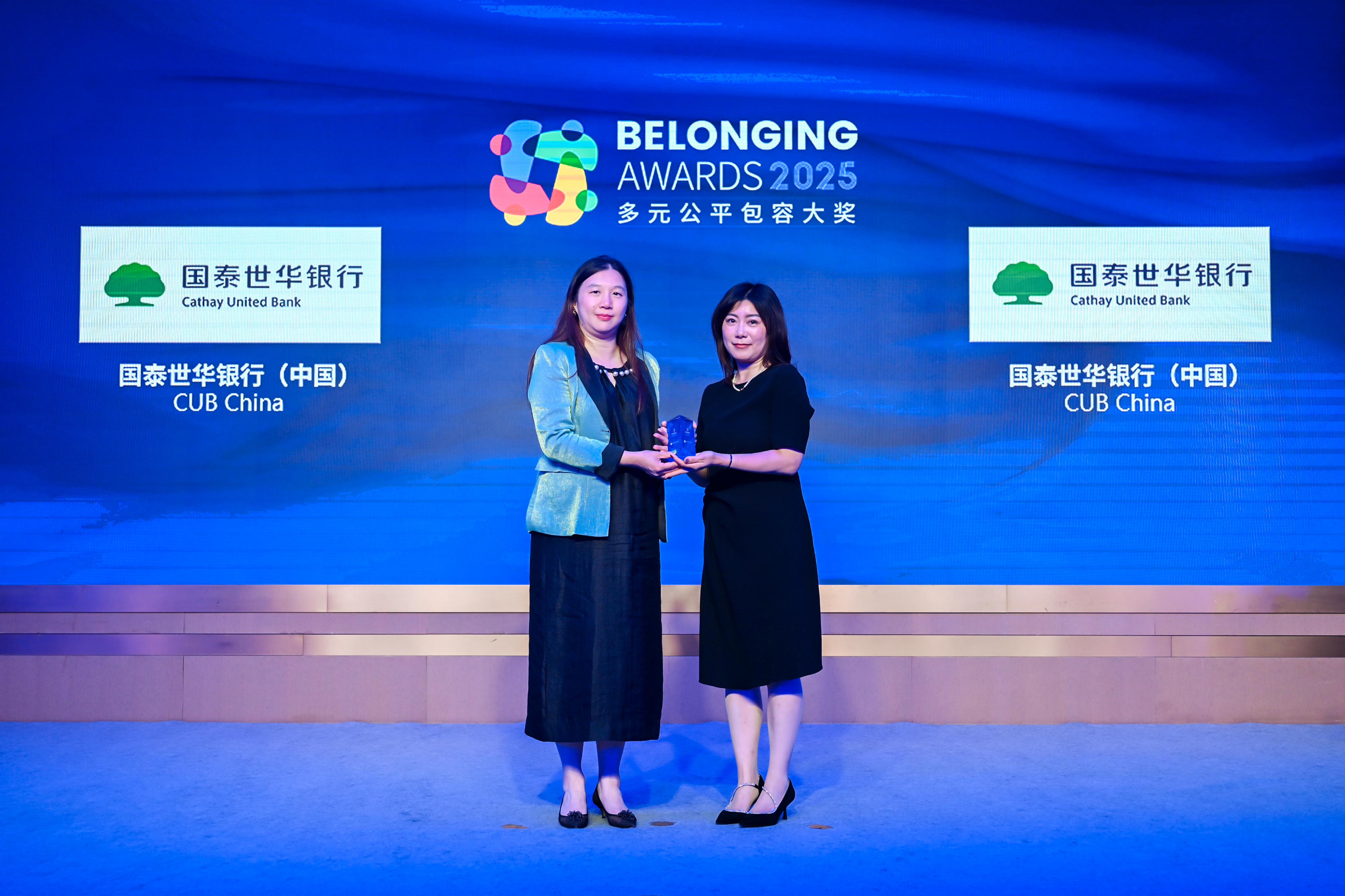 傅海洋女士(左)为国泰世华银行(中国)(右)颁发2025“多元公平包容大奖” (Belonging Awards)