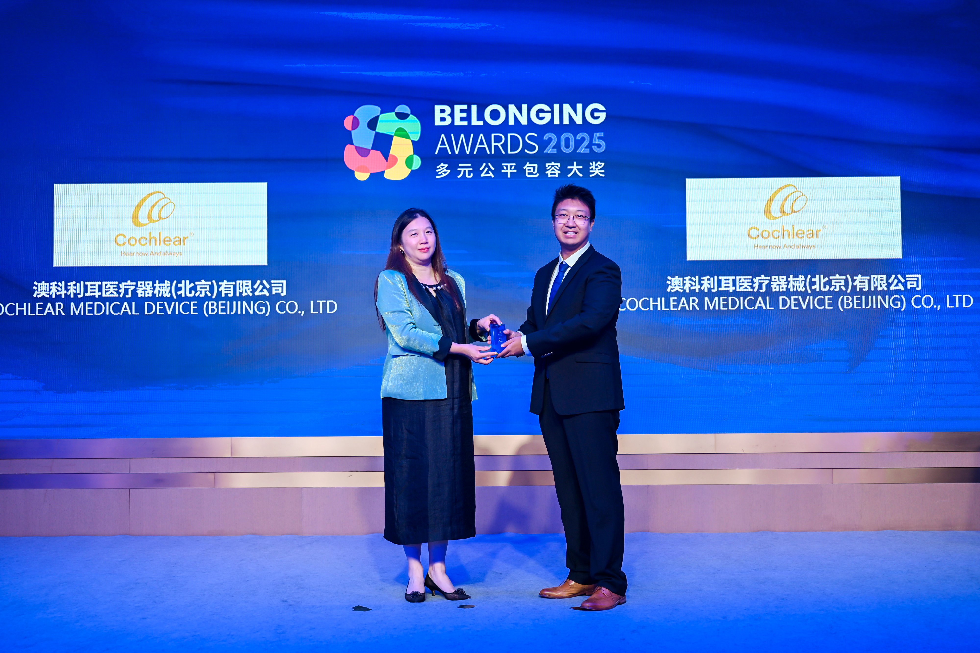 傅海洋女士(左)为澳科利耳医疗器械(北京)有限公司(右)颁发2025“多元公平包容大奖” (Belonging Awards)