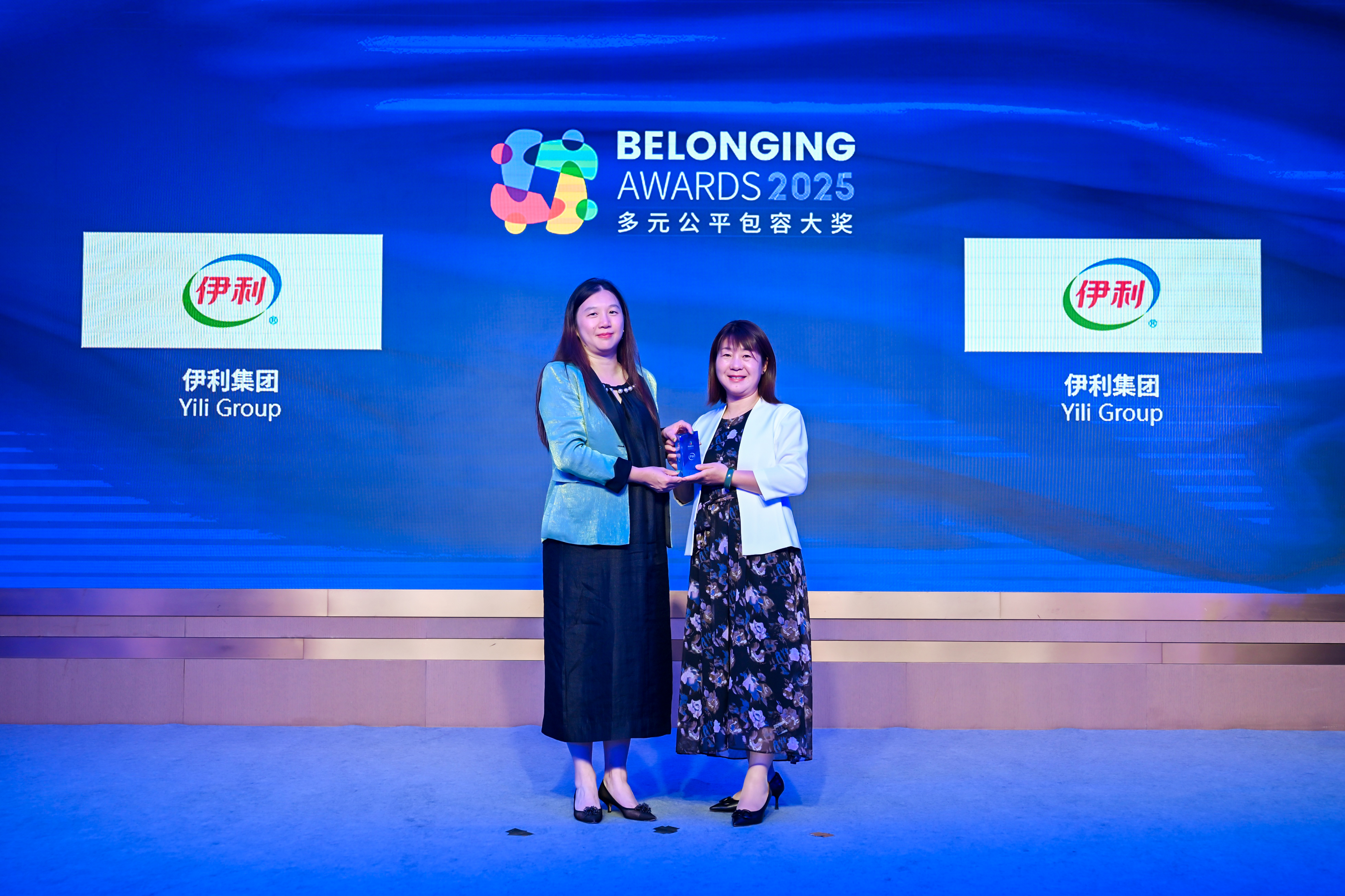 傅海洋女士(左)为伊利集团(右)颁发2025“多元公平包容大奖” (Belonging Awards)