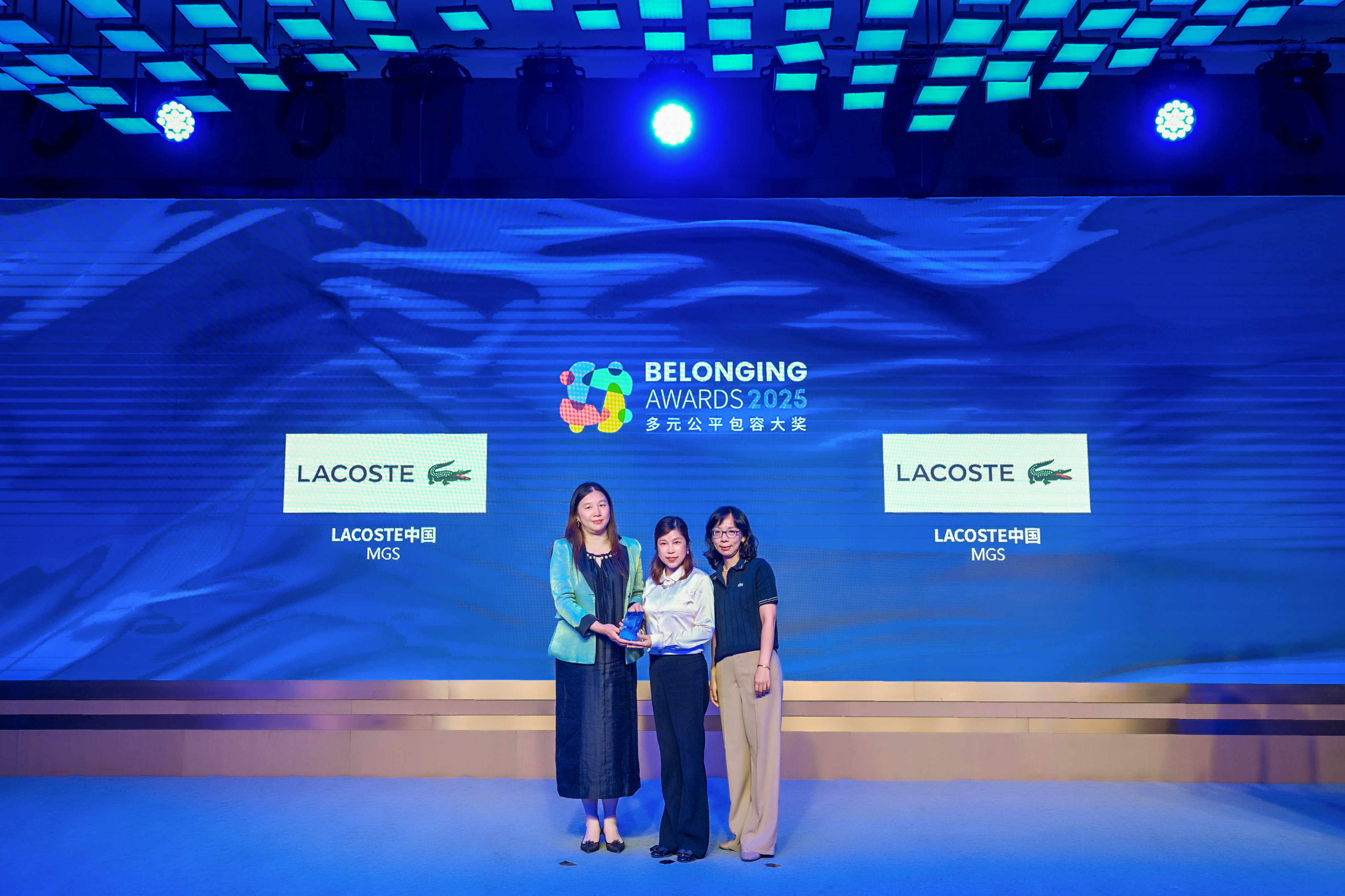 傅海洋女士(左)为LACOSTE中国(右)颁发2025“多元公平包容大奖” (Belonging Awards)