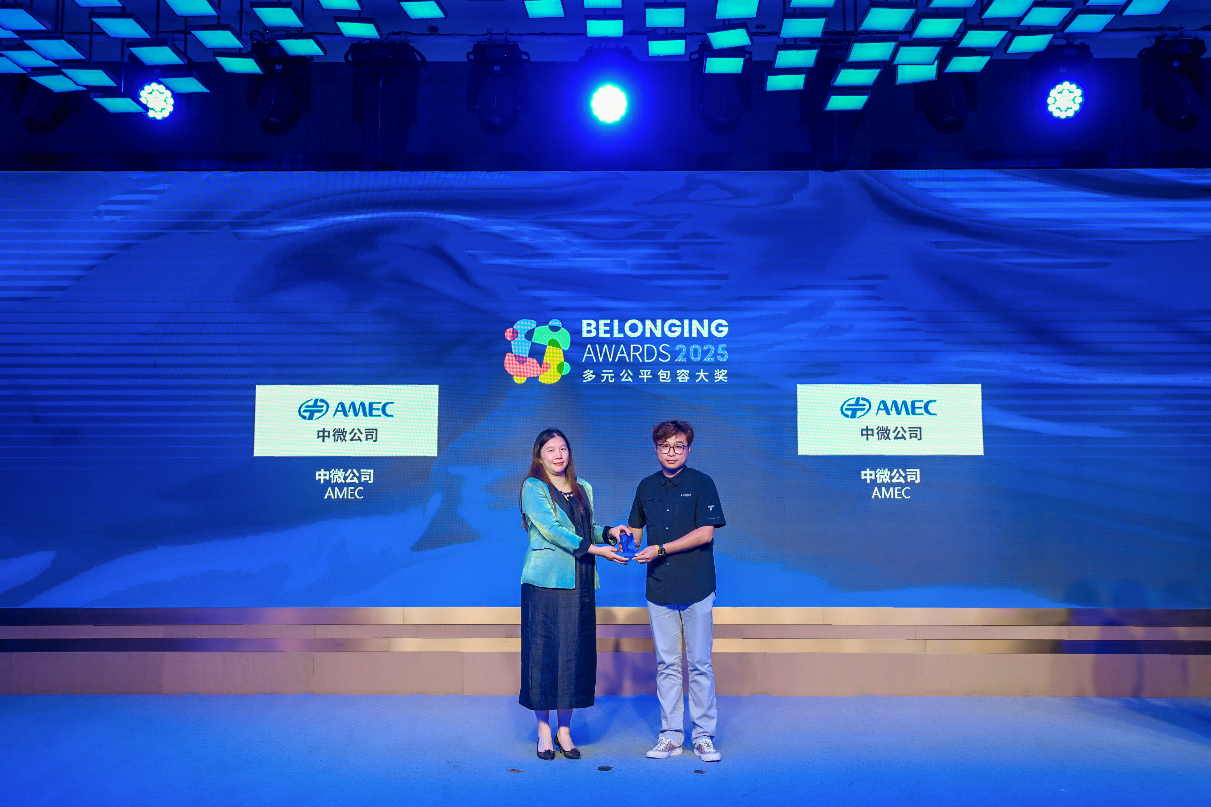 傅海洋女士(左)为中微公司(右)颁发2025“多元公平包容大奖” (Belonging Awards)