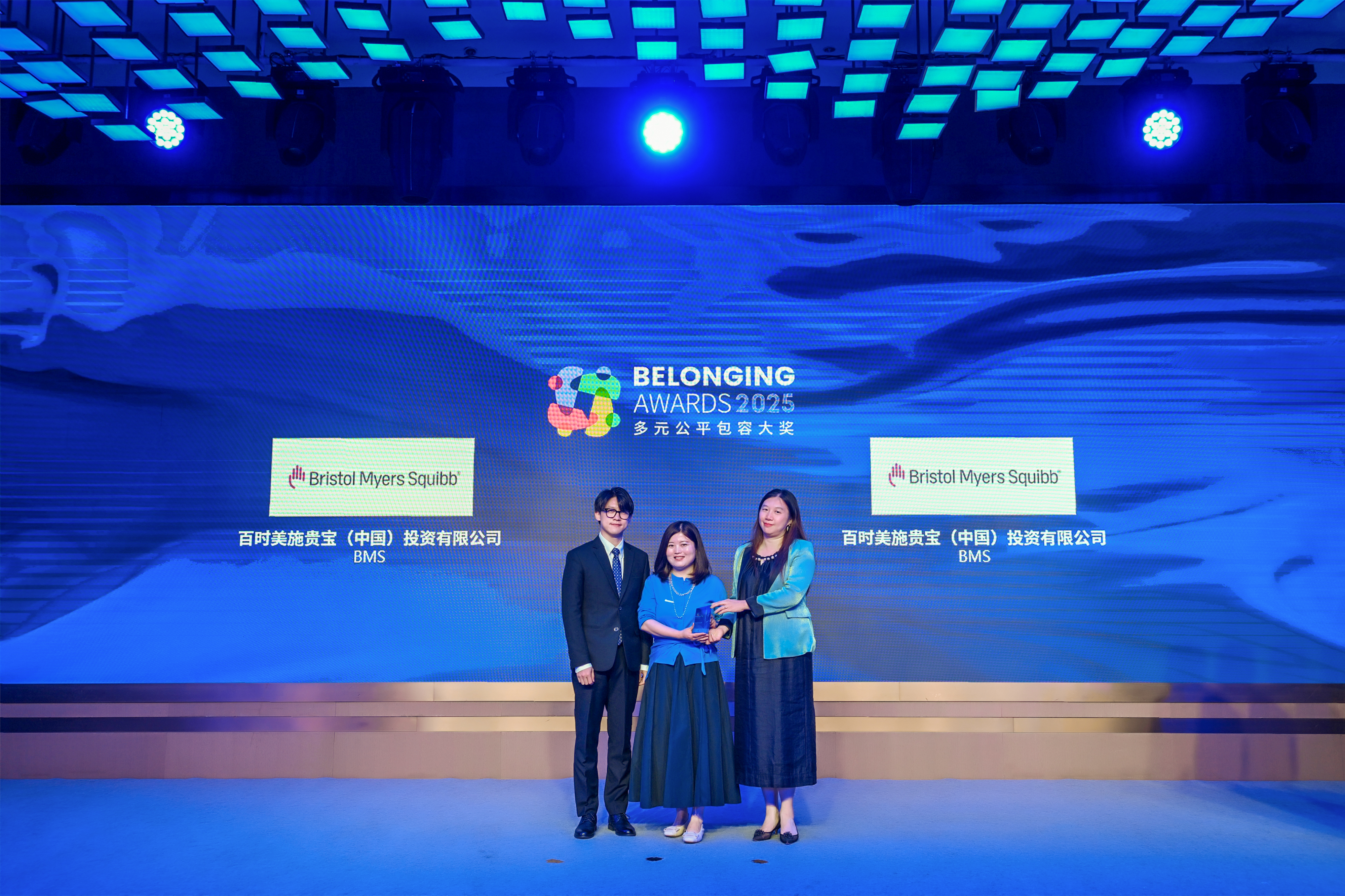 傅海洋女士(右)为百时美施贵宝(中国)投资有限公司(左一、左二)颁发2025“多元公平包容大奖” (Belonging Awards)
