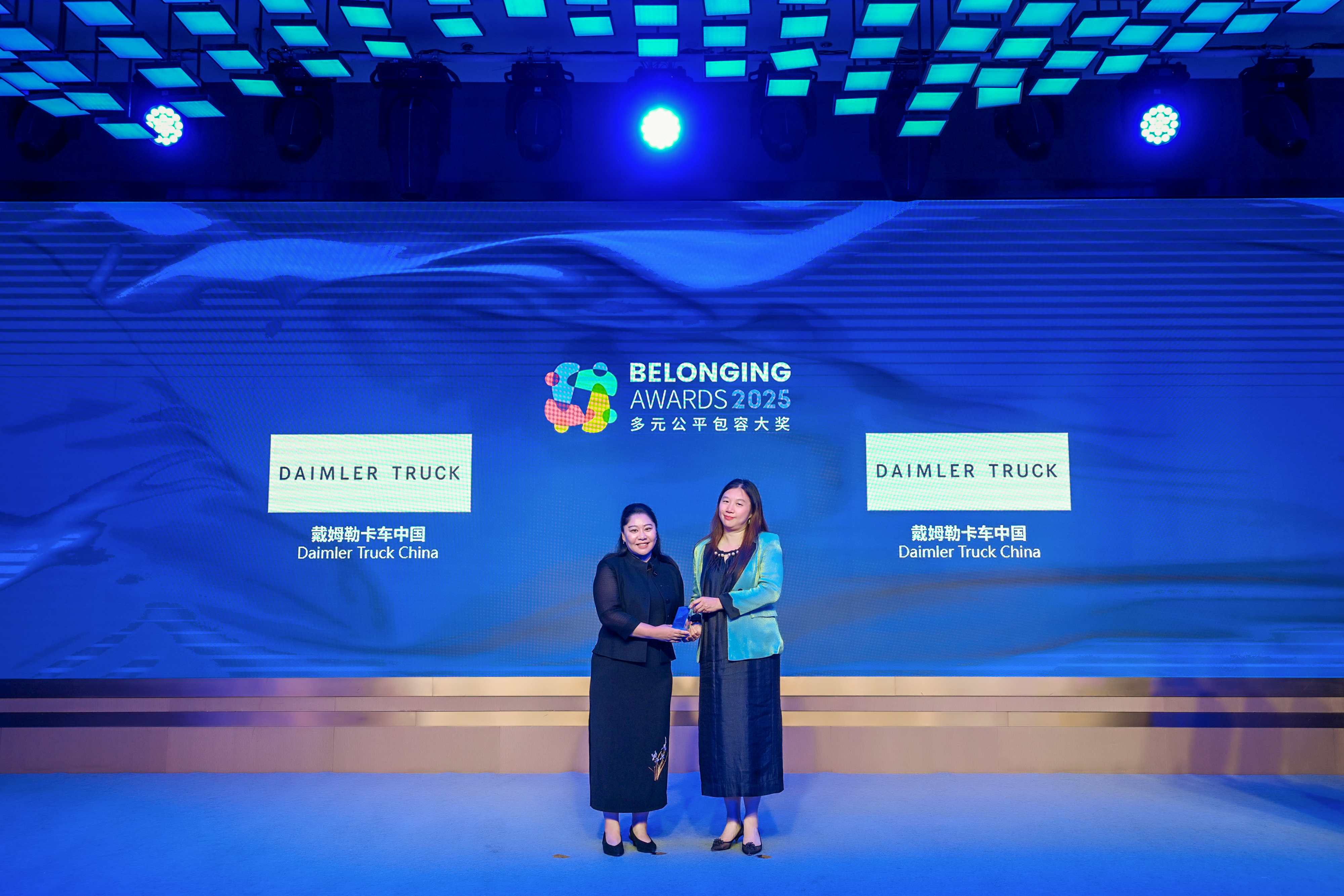 傅海洋女士(右)为戴姆勒卡车中国(左)颁发2025“多元公平包容大奖” (Belonging Awards)