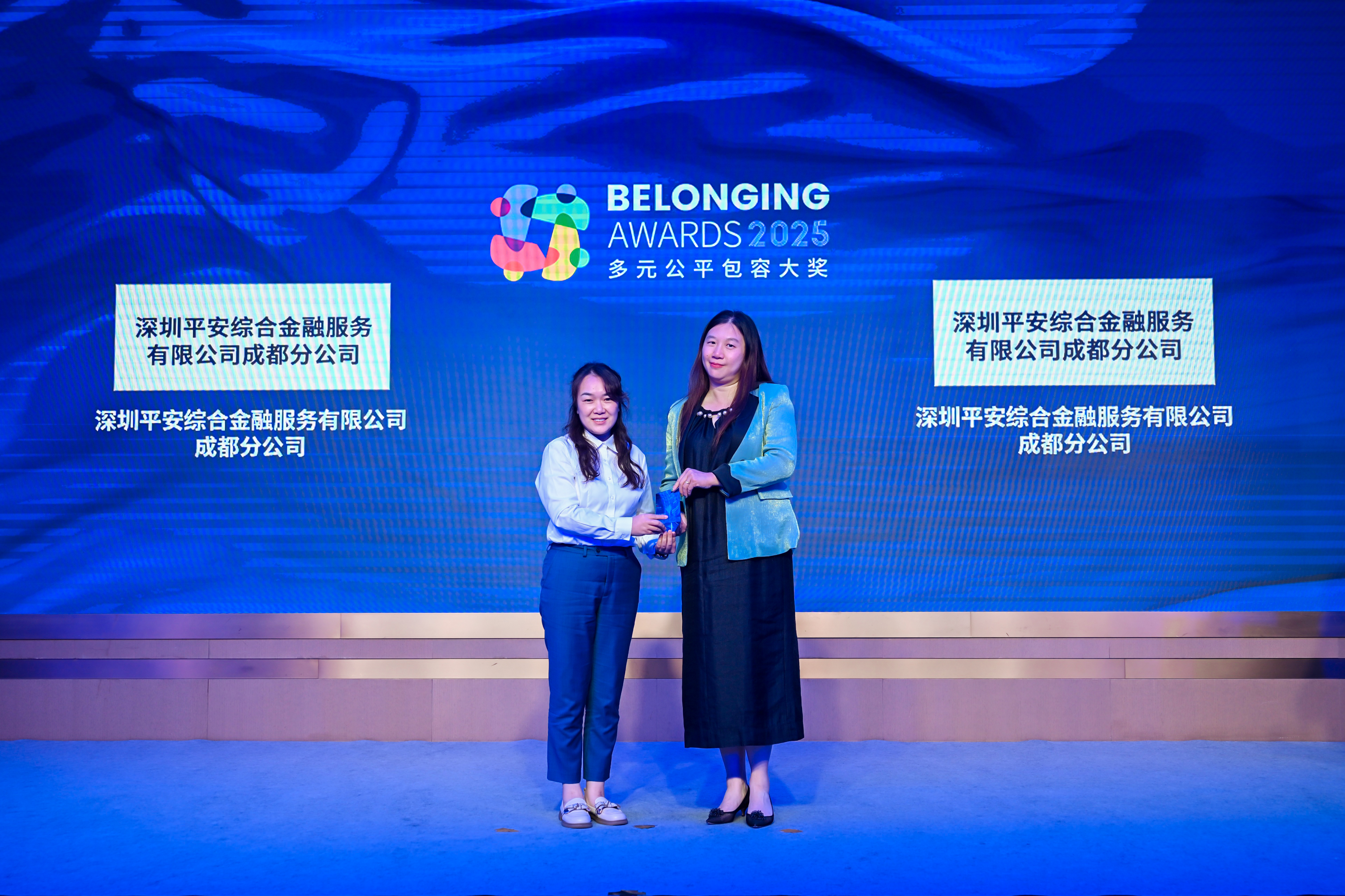 傅海洋女士(右)为深圳平安综合金融服务有限公司成都分公司(左)颁发2025“多元公平包容大奖” (Belonging Awards)