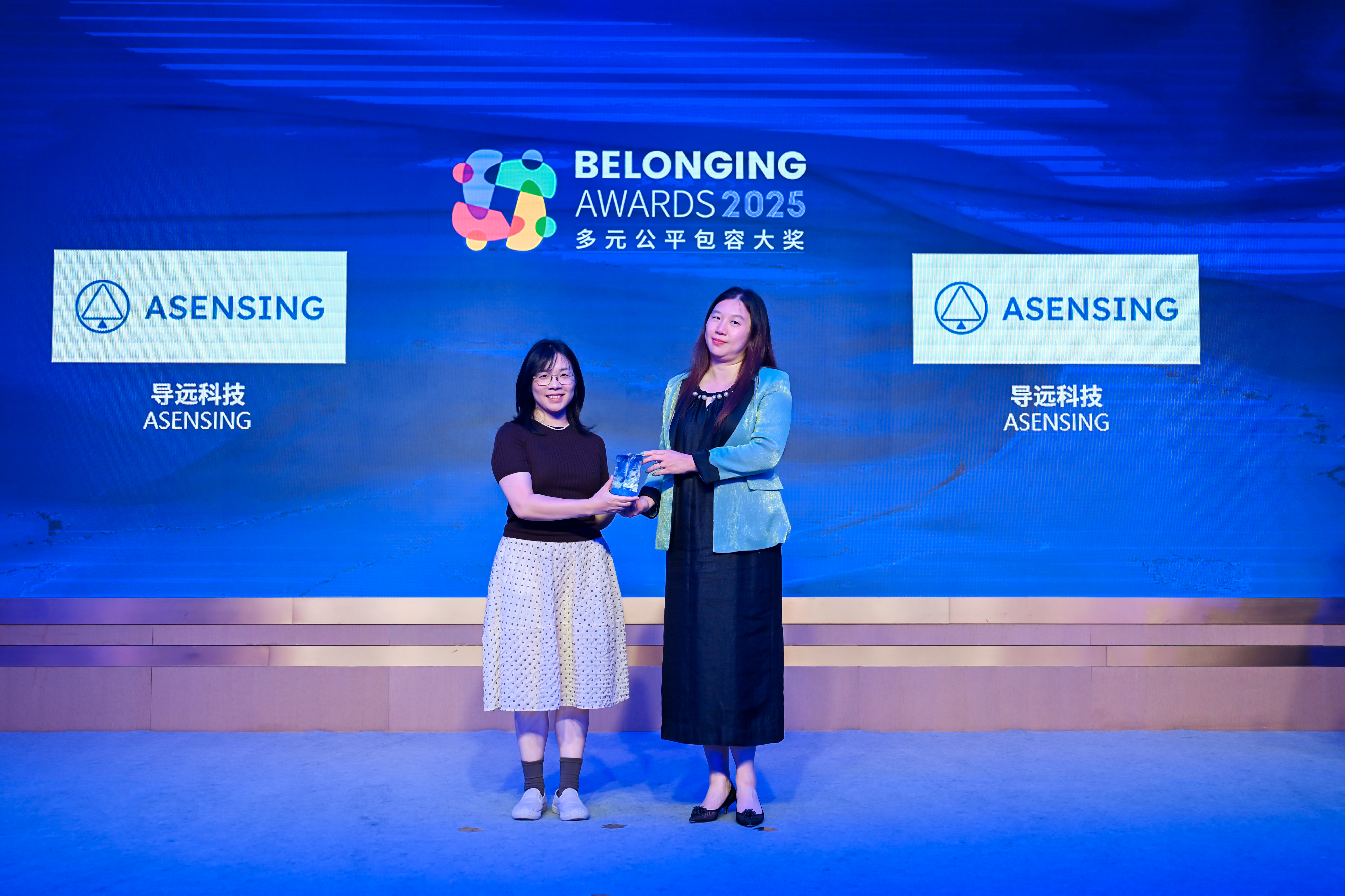 傅海洋女士(右)为导远科技(左)颁发2025“多元公平包容大奖” (Belonging Awards)