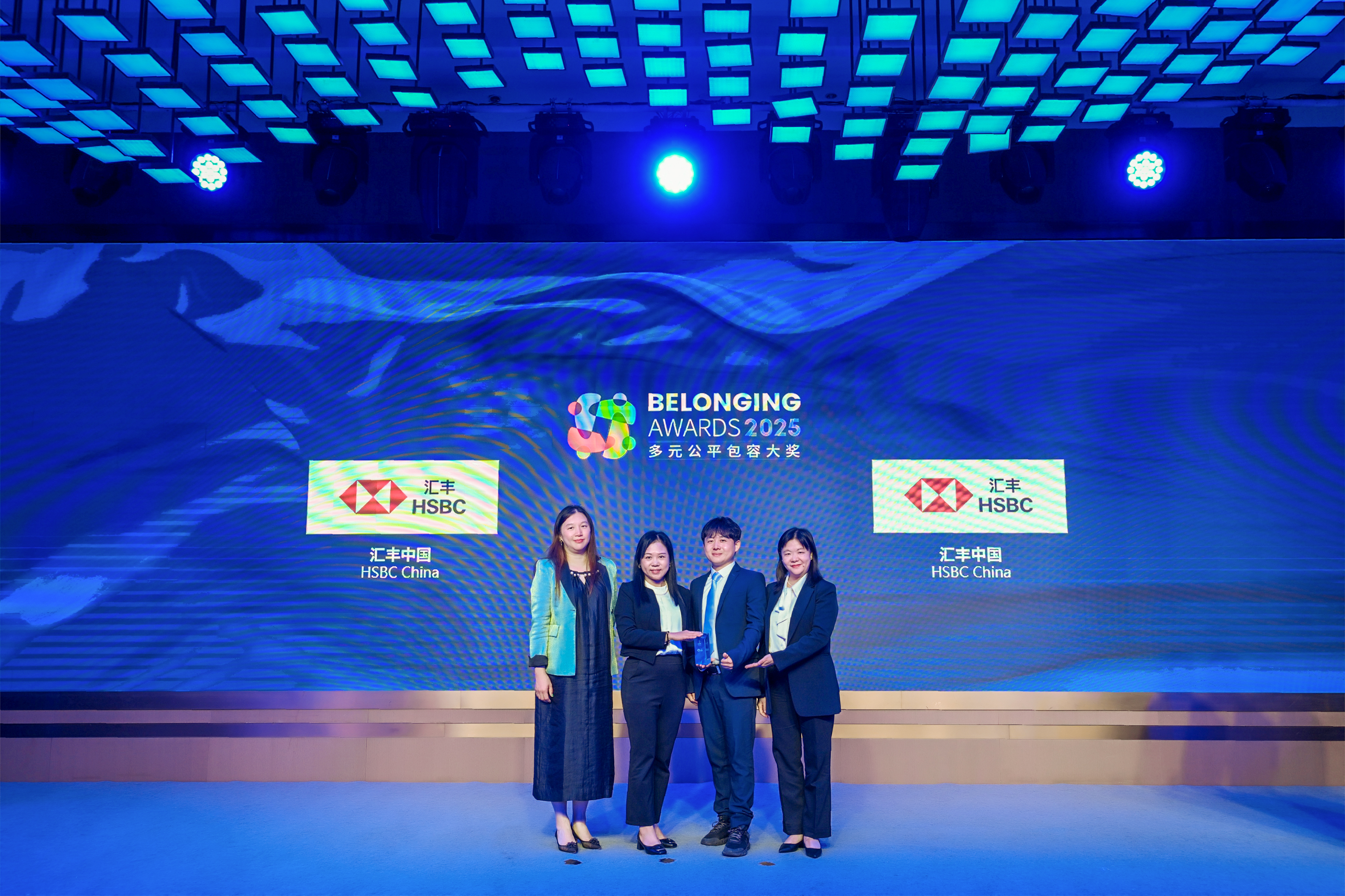 傅海洋女士(左)为汇丰中国(右一、右二、右三)颁发2025“多元公平包容大奖” (Belonging Awards)