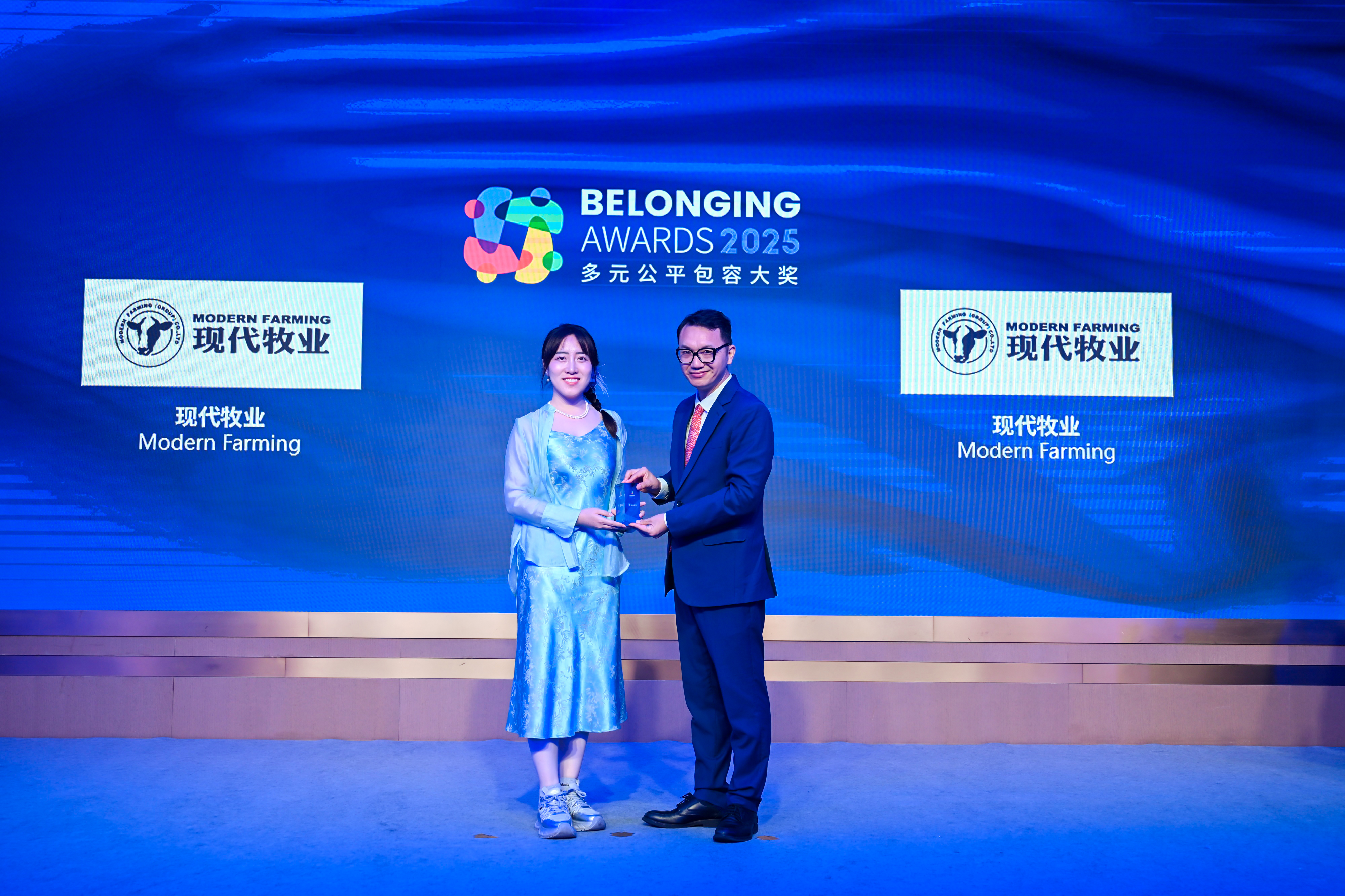 唐秋勇先生(右)为现代牧业(左)颁发2025“多元公平包容大奖” (Belonging Awards)