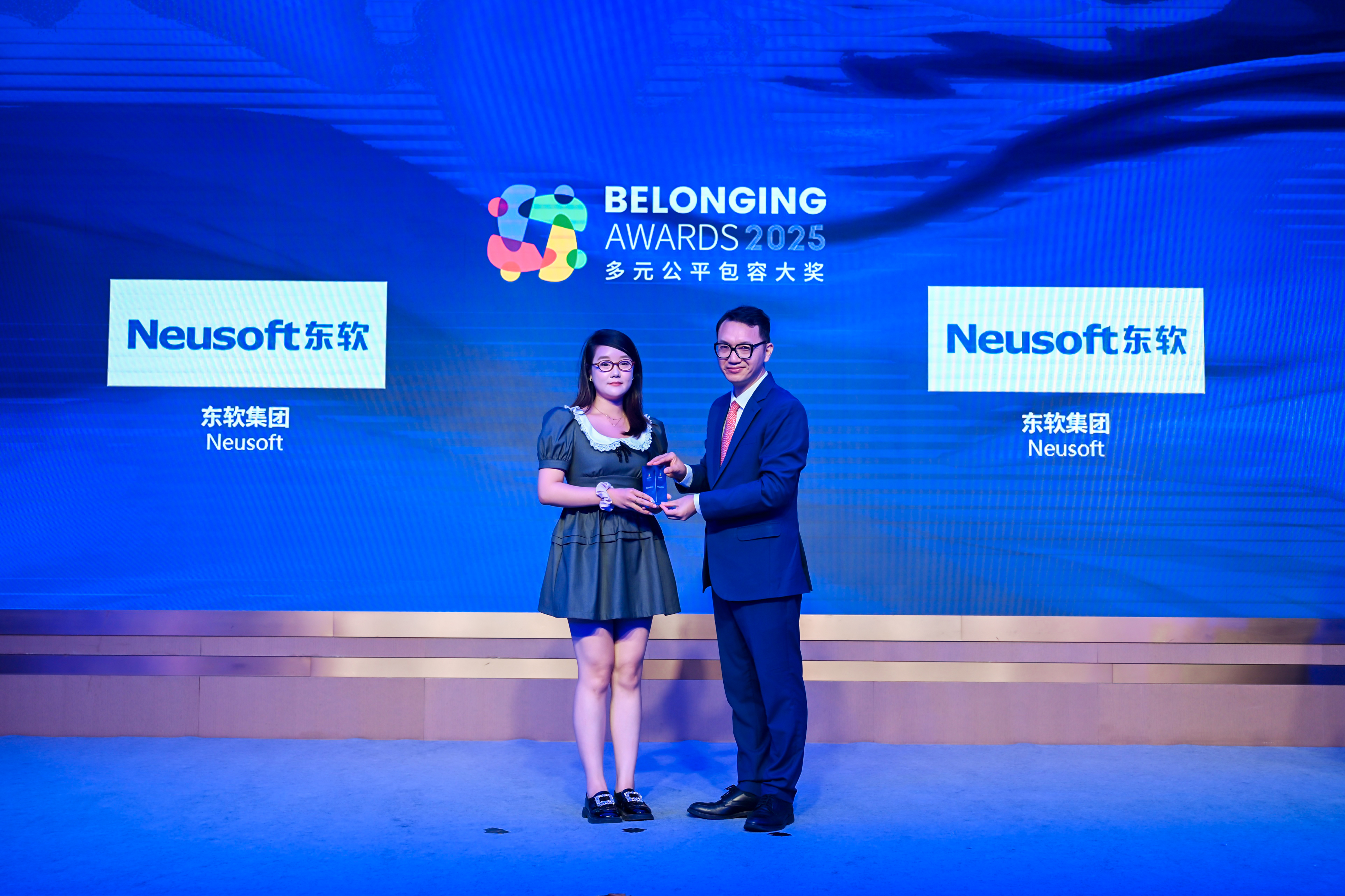 唐秋勇先生(右)为东软集团(左)颁发2025“多元公平包容大奖” (Belonging Awards)
