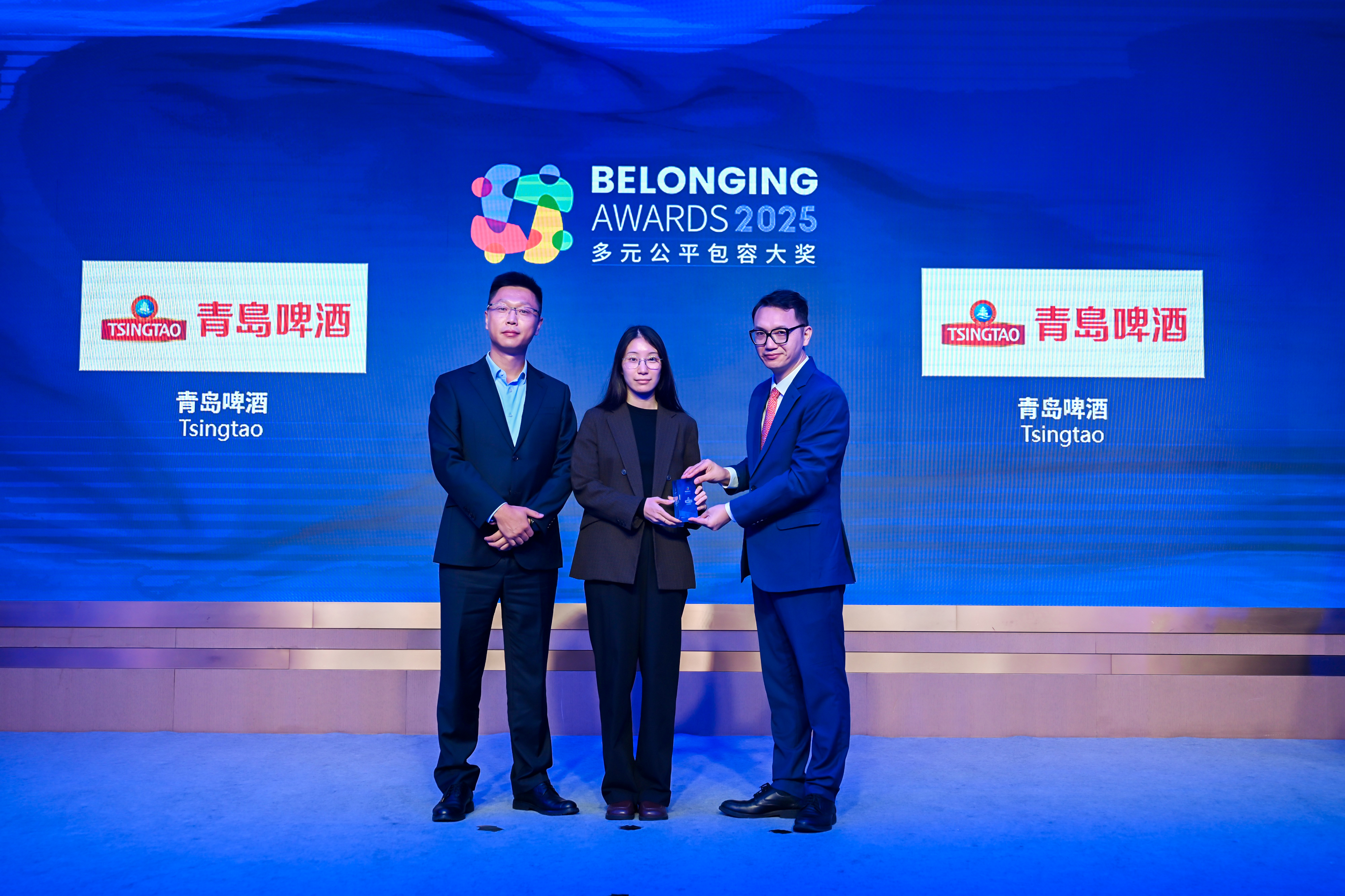 唐秋勇先生(右)为青岛啤酒(左一、左二)颁发2025“多元公平包容大奖” (Belonging Awards)
