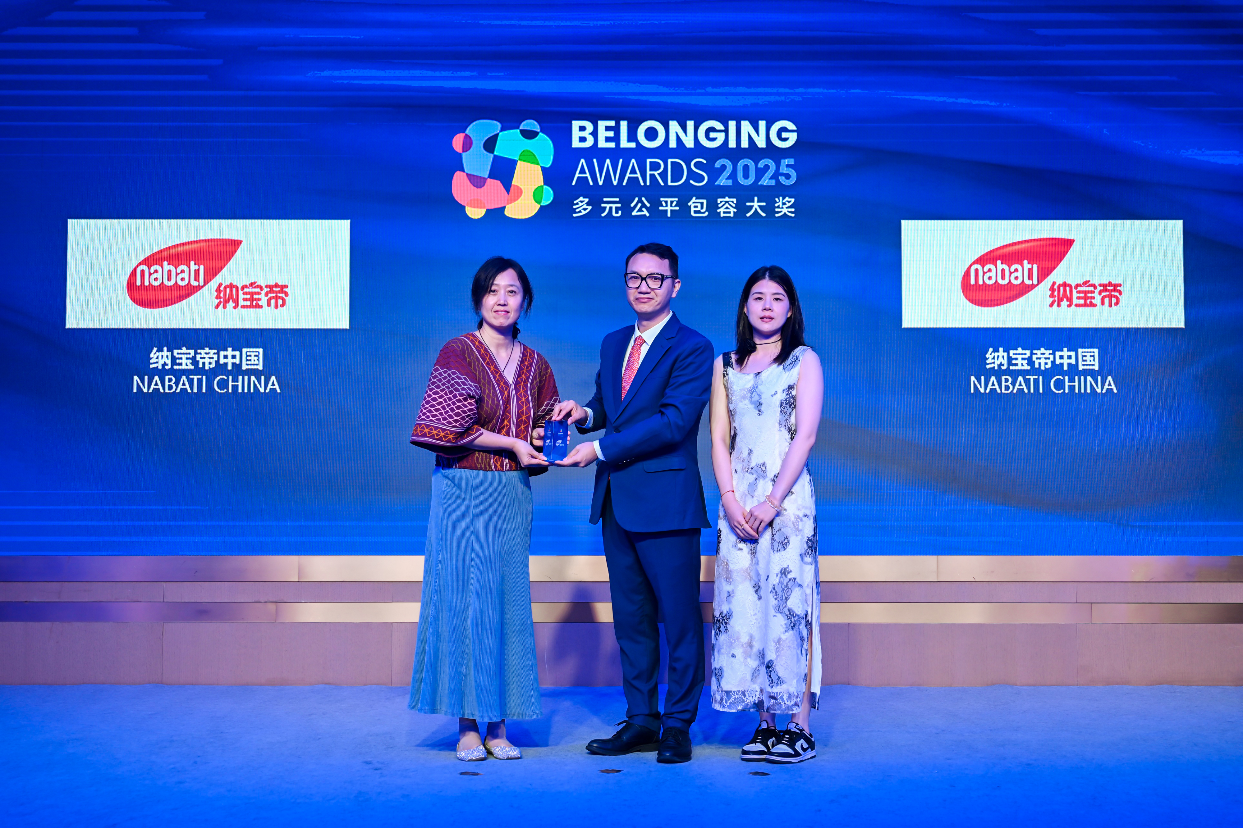 唐秋勇先生(中)为纳宝帝中国(左一、右一)颁发2025“多元公平包容大奖” (Belonging Awards)