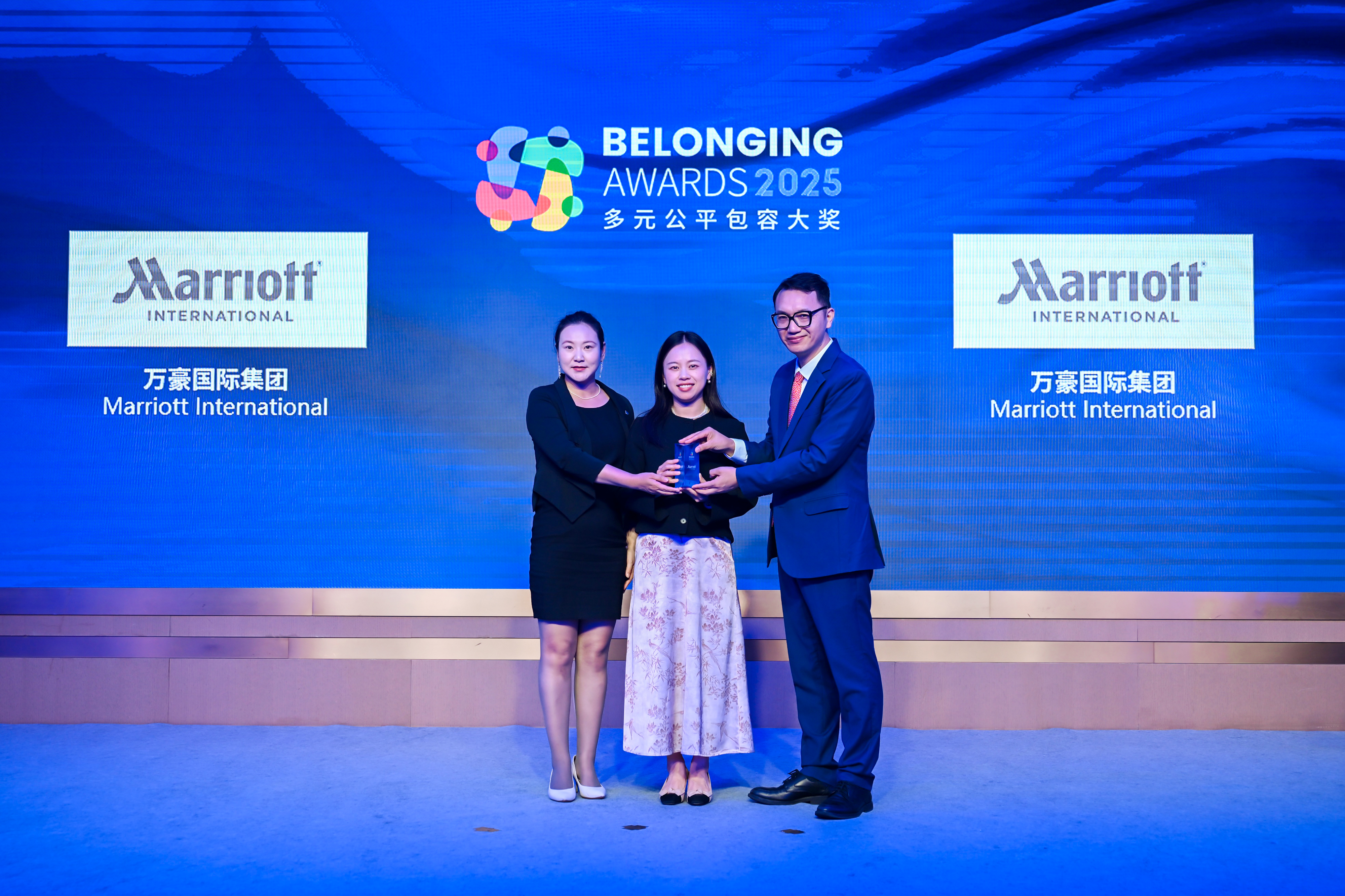 唐秋勇先生(右)为万豪国际集团(左一、左二)颁发2025“多元公平包容大奖” (Belonging Awards)