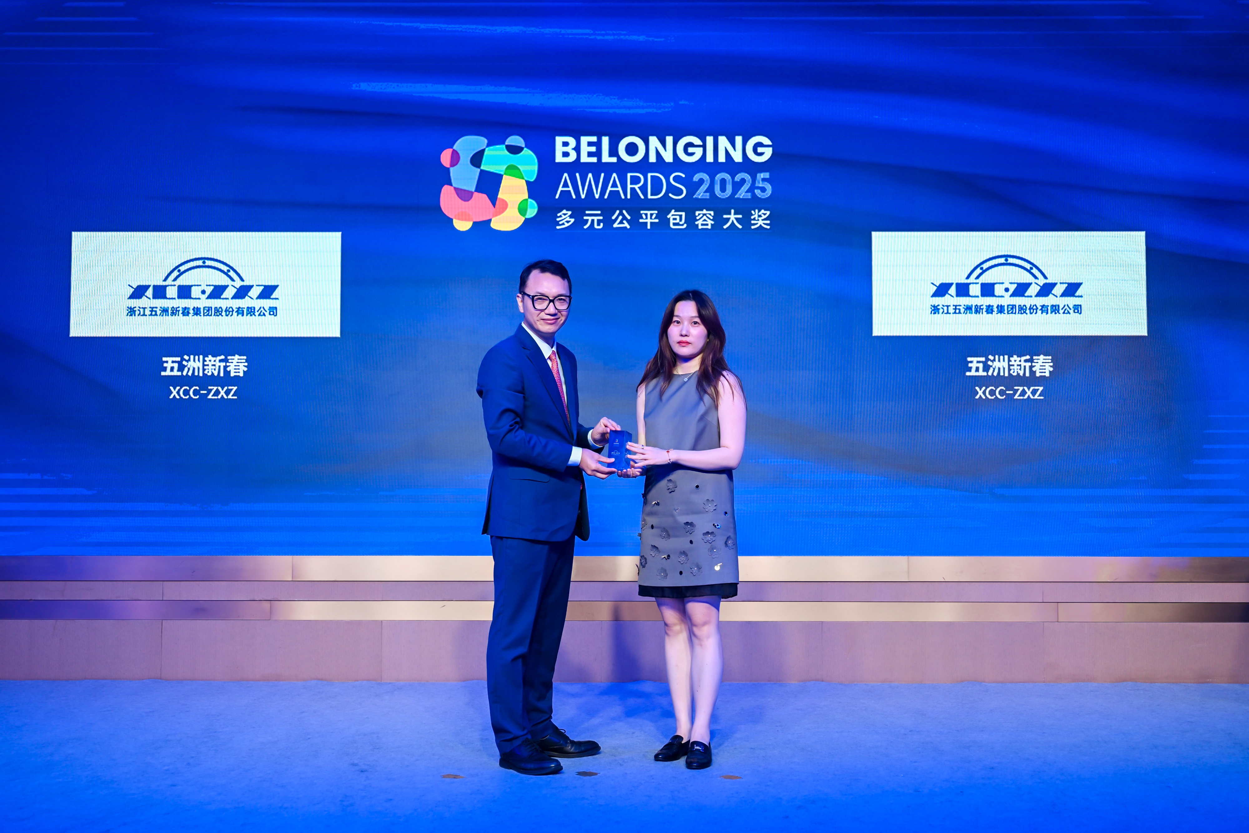 唐秋勇先生(左)为五洲新春(右)颁发2025“多元公平包容大奖” (Belonging Awards)